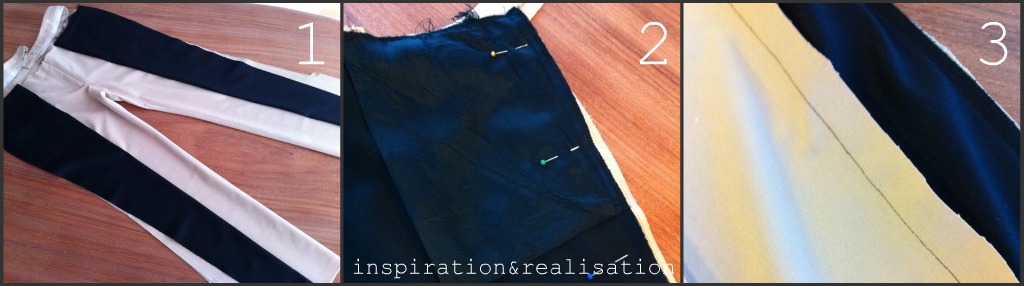 1 & 2 * Dissection the two pay of pants, by ripping off the seams. On the camel one, need to rip off only the external one.